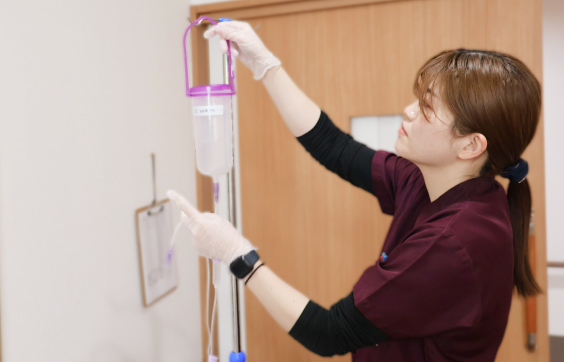 バイタル測定、全身状態の観察、医療処置、内服確認などを行う。